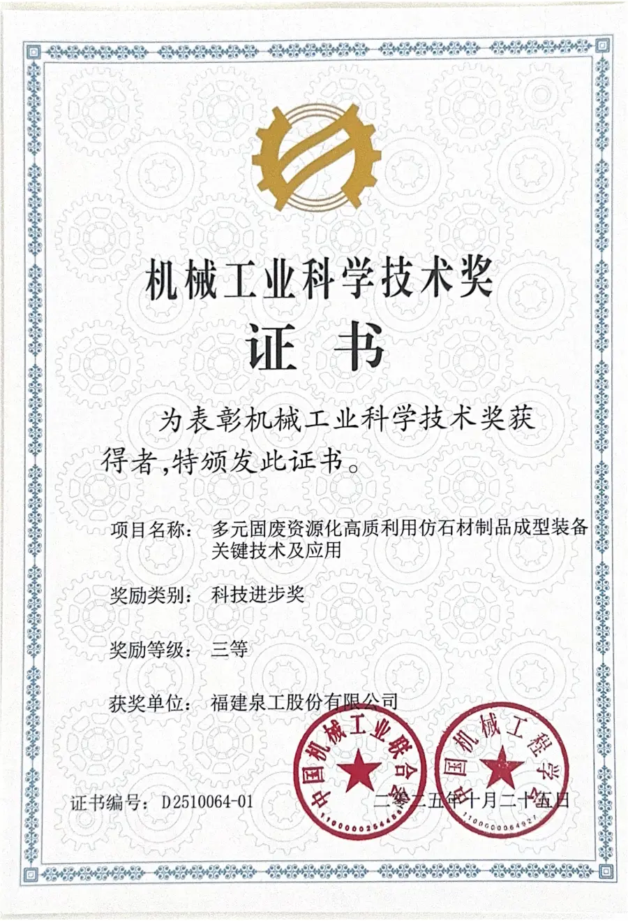 このほど、2025年中国機械産業科学技術賞の受賞者リストが正式に発表された。 Fujian Quangong Machinery Co., Ltd.が主導するプロジェクト「多様な固形廃棄物資源を模擬石材製品に高価値利用するための成形装置の主要技術と応用」プロジェクトが技術進歩部門で第3位を受賞した。この受賞は、当社の高い評価を十分に表しています。クアンゴン機械株式会社固形廃棄物資源の高価値利用と模擬石材製品のインテリジェント成形装置の分野における技術革新能力とエンジニアリング応用実績。