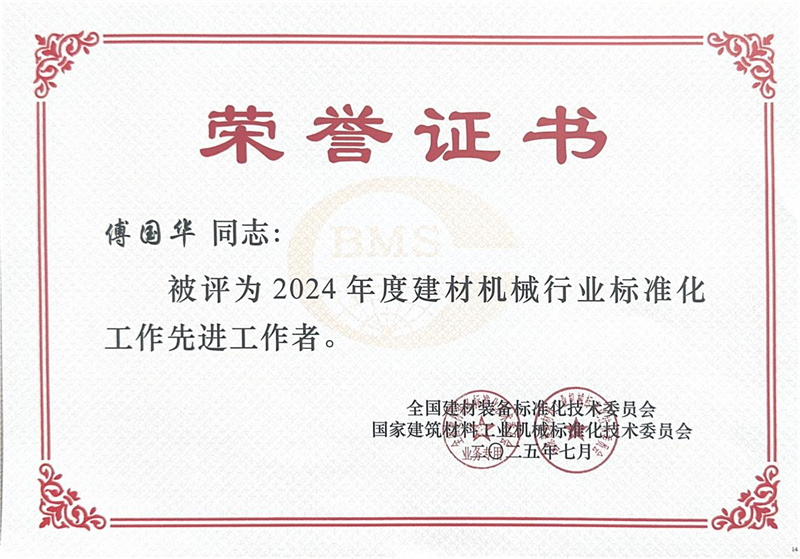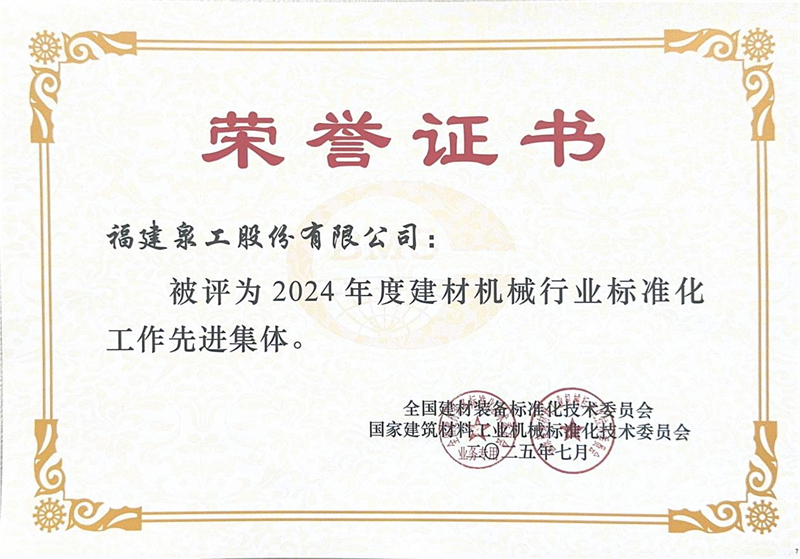 同時に開催された表彰式で、Quangong Machinery Co.,Ltdは「2024年建材機械業界の標準化作業の先進集団」の称号を、同社副総経理の傅国華氏は「2024年建材機械業界の標準化作業の先進者」の称号を授与された。